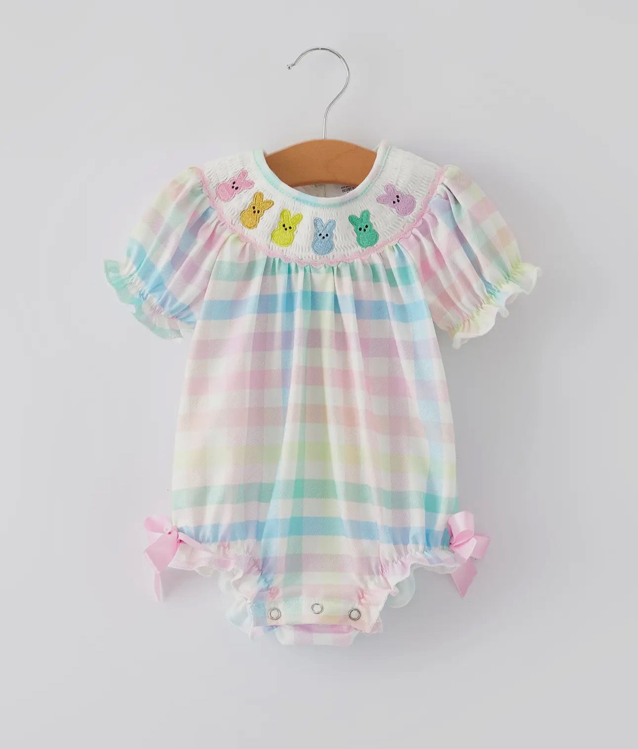 Easter Bunny Embroidery Girls Pink Plaid Bow Romper