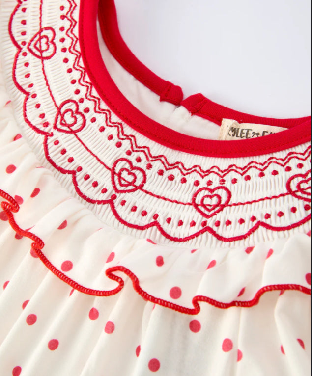 Valentine’s Day Polka Dot Girls Romper with Smocking Embroidery